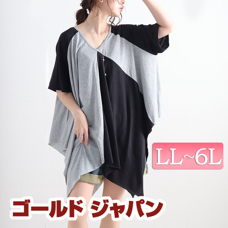 【LL-6L】Vネックデザインチュニック 大きいサイズ レディース トップス チュニック 半袖 半そで 半袖チュニック 変形裾 Vネック バイカラー シンプル 無地 半袖トップス 大きな 大きめ 大 夏服 夏物 LL 2L 3L 4L 5L XL XXL LLサイズ 13号 15号 17号 19号 グレー