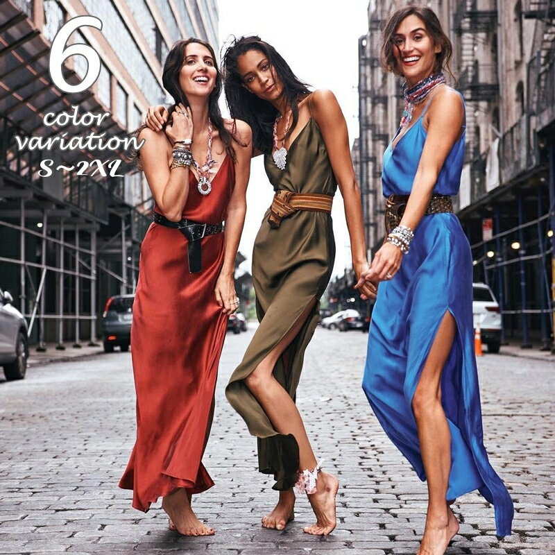 送料無料 ワンピース キャミワンピ レディースVネック ロング タイト 深スリット 背中開き ノースリーブ 袖なし セクシー スリム 春夏