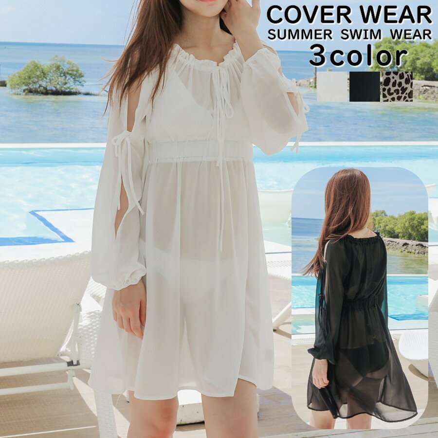 送料無料 ワンピース チュニック 長袖 ミニ丈 水着の上に カバーアップ シースルー 透け感 カバーウエア 体型カバー レディース Aライン フレアスカート セクシー ビーチウエア ドローストリングネック アームスリット おしゃれ フェミニン シンプル