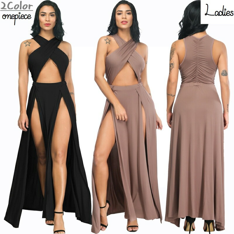 送料無料 パーティードレス ワンピース ノースリーブ ホルターネック ロング丈 背中開き プランジングネック マキシ丈 スリット セクシー レディース フレアスカート 単色 ソリッドカラー 女性用 婦人用 S M L XL 2XL