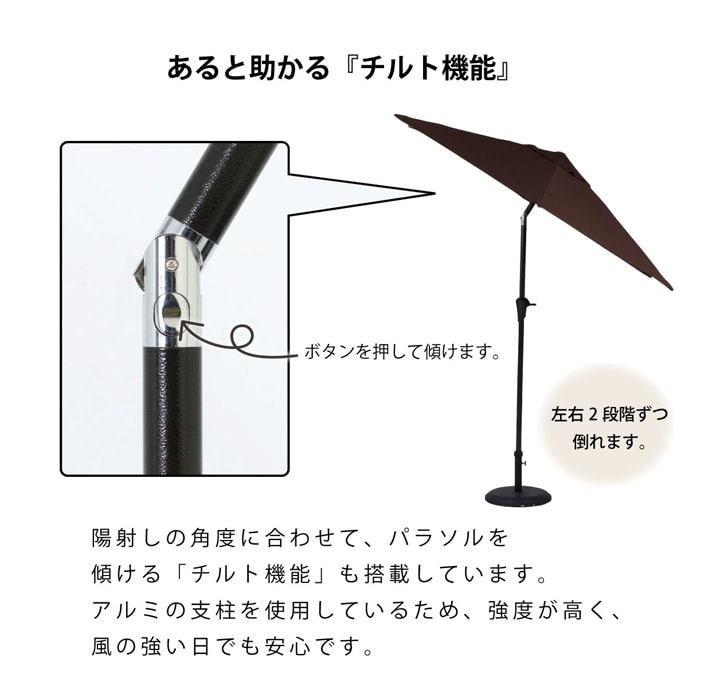 ■ 上部チルト式で角度の変更ができ、日差しの強い日は太陽の位置に合わせて傘の向きを変えて、効率よく日陰を作れます。