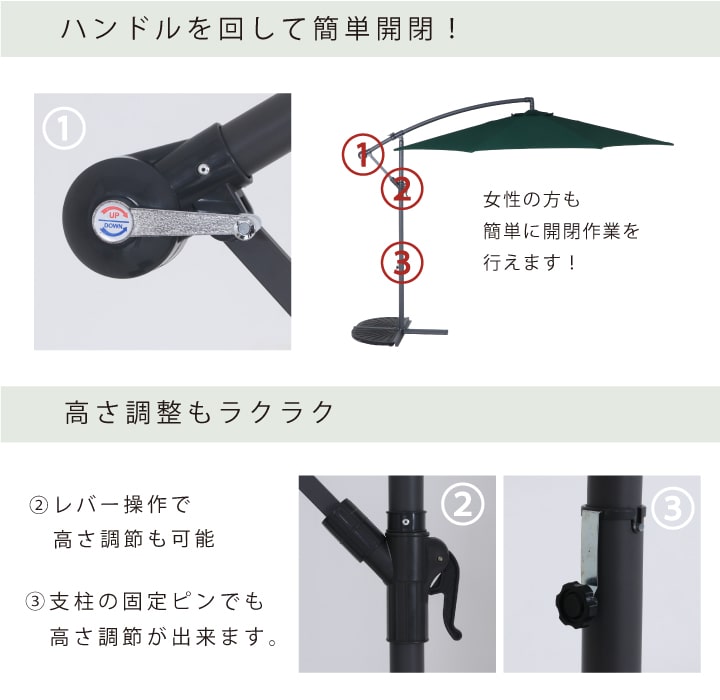■ クランクを回して傘を開閉できるので、取扱いが簡単です。