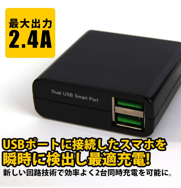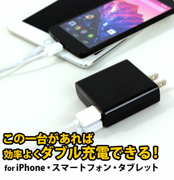 送料無料【月間優良ショップ】スマホ iPhone IQOS充電器高出力 2.4A 急速充電スマホ2台を効率よく同時充電【ブラック】IACU2-024ADKゆうパケット キャンプ アウトドア